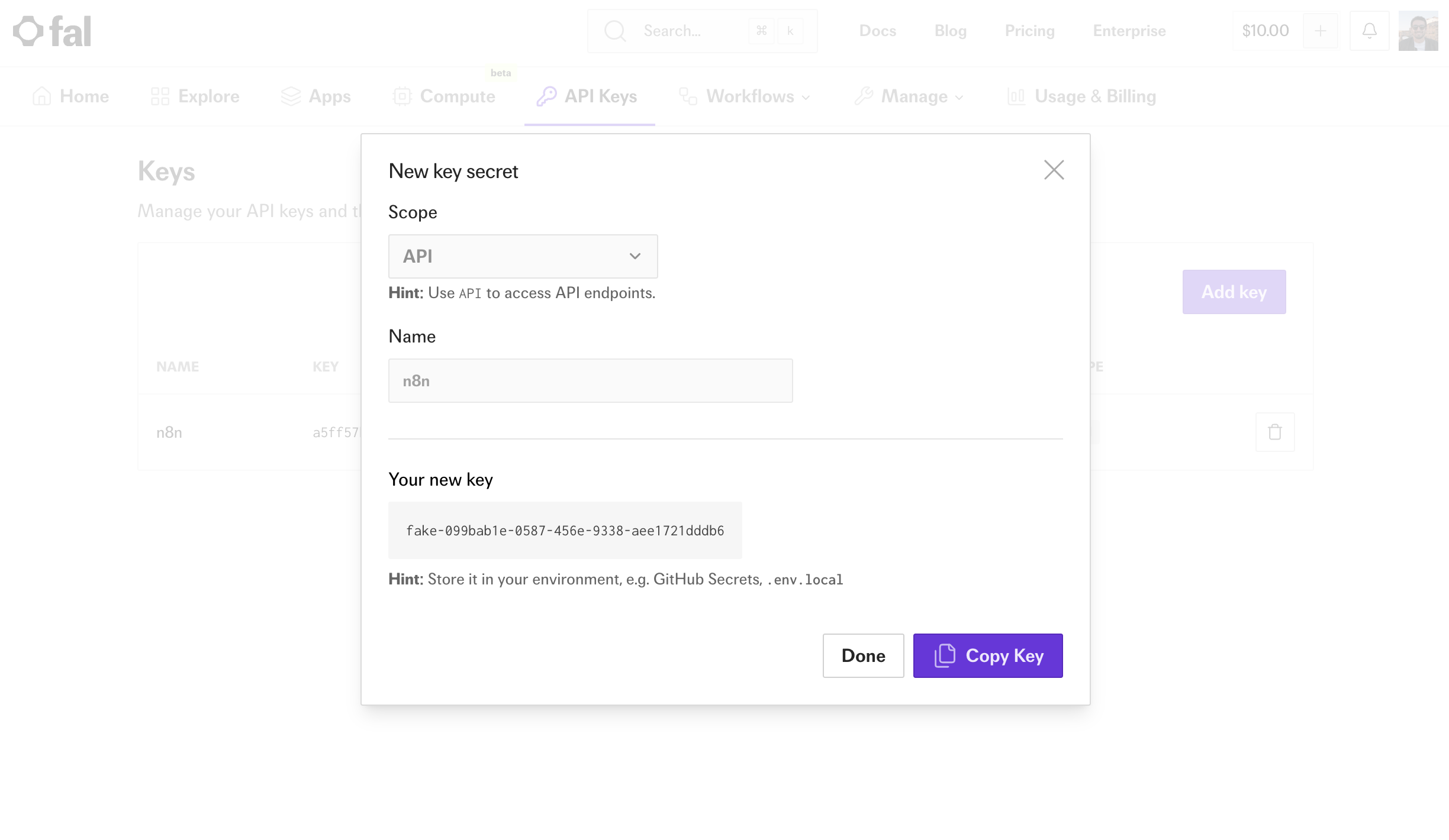 Navigate to fal.ai API Keys, create a new key and copy its value.