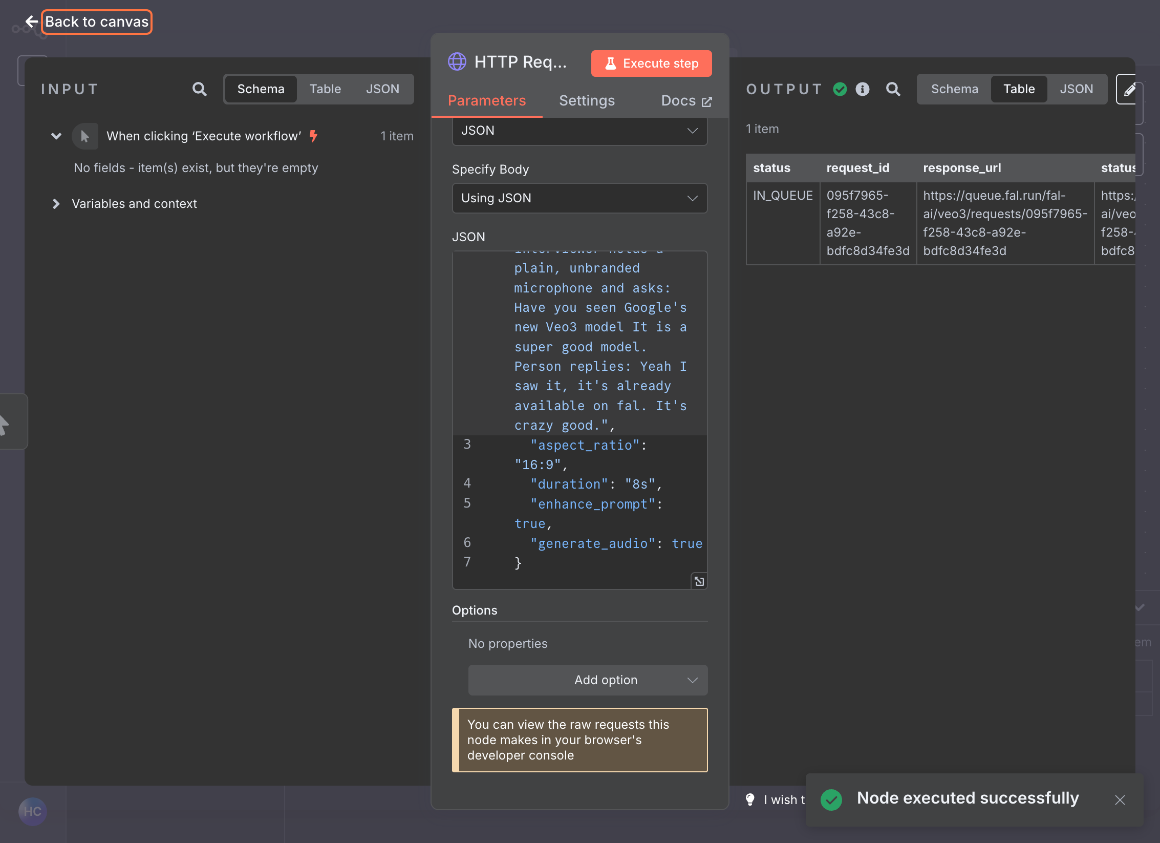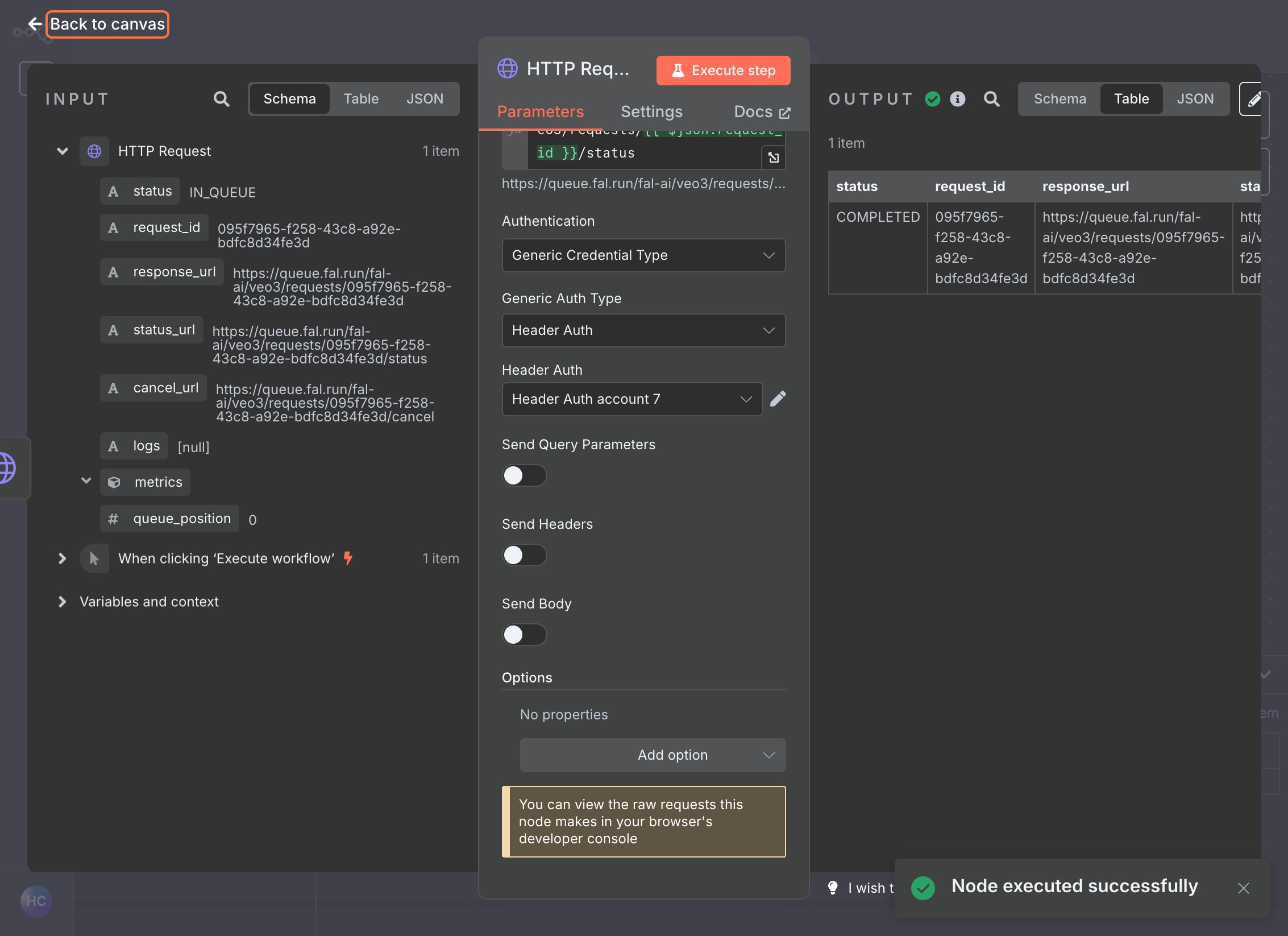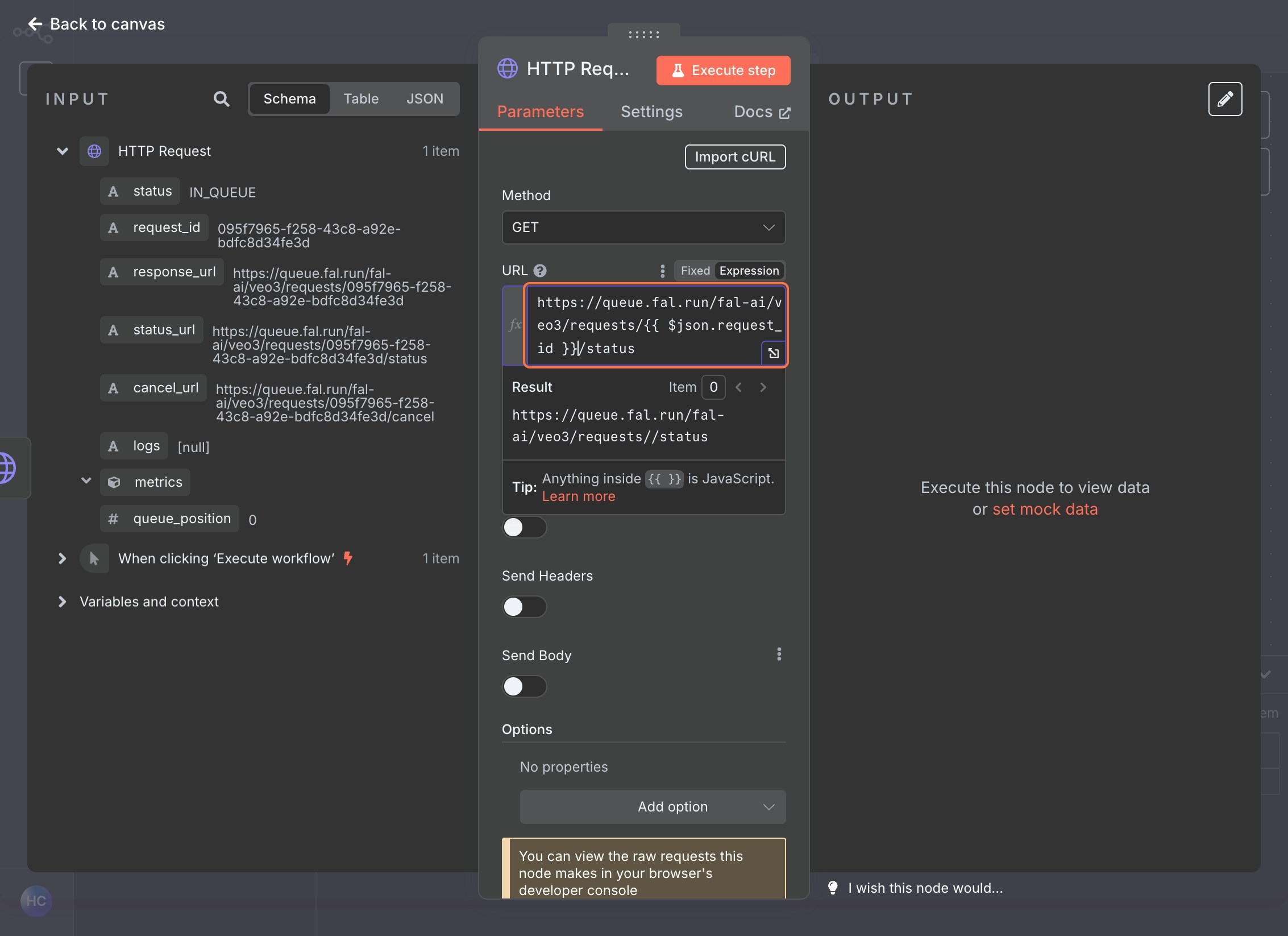 Click Execute Node to test the request. You should receive a response with a request ID.